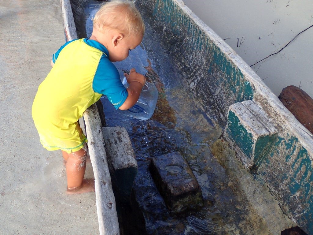 Gleich hinter Nargana mündet ein kleiner Fluss ins Meer, der Rio Diablo. Verwegene Abenteurer wie uns zieht so ein Name natürlich magisch an, wir rüsten das Dinghy für die Expedition aus und starten los. Zwei Stunden, viel Benzin und lange Umwege später finden wir endlich die gar nicht so versteckte Flussmündung und tuckern langsam stromaufwärts. Wir wissen, dass es hier Krokodile gibt, sehen aber nur unzählige Vögel, darunter einen Tukan. Nach einiger Zeit wird der Fluss immer seichter, und schlussendlich müssen wir aussteigen und das Dinghy festbinden. Dafür ist das Wasser mittlerweile unglaublich klar und sauber, wir füllen also irgendwo mitten im Dschungel unsere mitgebrachten Wasserkanister auf, Kat und Jorge haben überhaupt gleich ihren Schmutzwäschesack mitgenommen und waschen Wäsche. Coole Sache irgendwie.